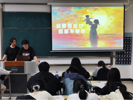 “同學(xué)們,猜一猜明天是什么節(jié)日啊?”“母親節(jié)!”5月11日,新聞傳播學(xué)類專業(yè)2023(7)、(8)班在K202教室開展以“愛要說出口,感恩不等待”為主題的團建活動。活動開始前,活動負責(zé)人、新聞傳播學(xué)類專業(yè)2023(7)、(8)班的班長楊雨霏、朱研溪提前為每位同學(xué)準(zhǔn)備好信紙和信封。朱研溪說:“我們希望通過寫信這種傳統(tǒng)而深情的溝通方式,讓同學(xué)們勇敢表達自己的心聲,將對母親的愛訴說于筆尖。”學(xué)生們觀看一段關(guān)于母愛的感人短片后,...